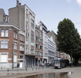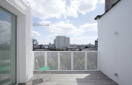 The Boulevard d'Ypres and the Quai du commerce form an angle leading to the south on the shore gate. It was almost at the end of this block that two identical buildings were built in 1933, each opening onto one of the two avenues and meeting in the center of the crossing plot, creating a patio allowing light to be rear of the dwellings making up the building. The two facades visible from the public space are strictly identical. Inspired by art-deco, they were designed by Teughels, the architect of the complex. The double extension project was designed to adapt to this double situation by working the volume in a different way to adapt to the built templates of the street. The former maids' rooms have thus been reworked and raised to recompose the perspective in the street by harmonizing with the volumes already in place. In order to preserve and enhance the original building, the extensions have been set back. The railing of the passageway thus formed coming to cap the building by passing behind the old ornate pediment. The volumes have been cladded with a perforated skin in light aluminium. The load-bearing structure, under the skin, is perceptible and gives a rhythm to the whole which extends the structuring elements of the old facade.