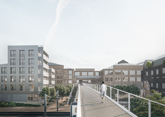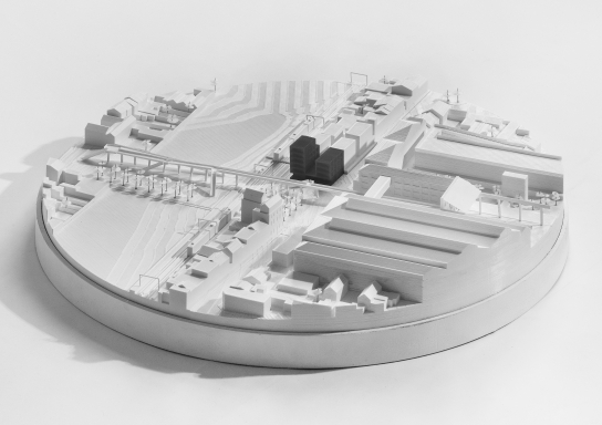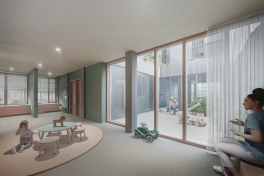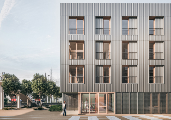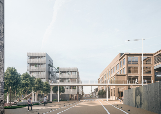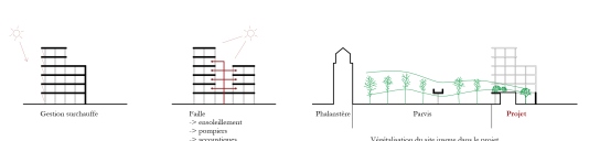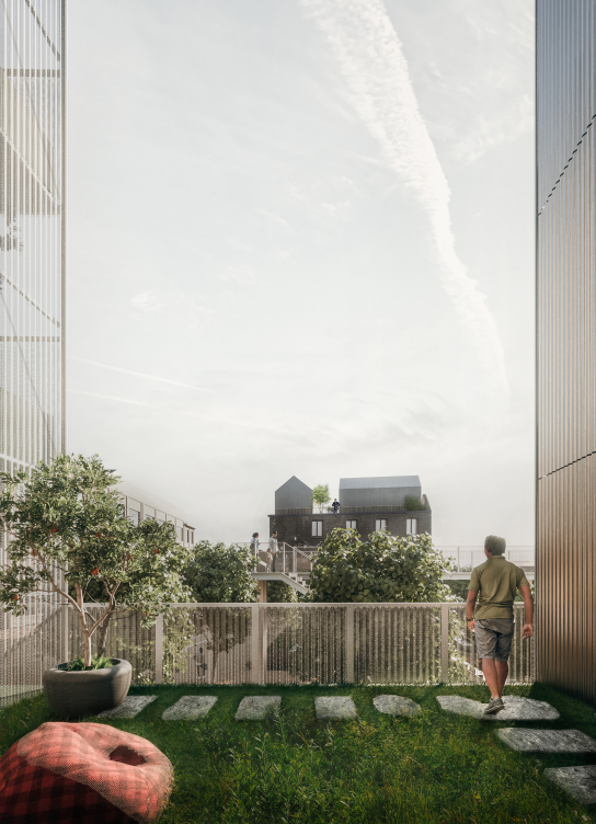 The site is marked by the presence of structuring axes. This is a crossroads. The plot is between the axis of the rail and that of Nicolay Street, at the meeting point with the axis of the central workshops and the footbridge. These different lines of force are never parallel or perpendicular. The project takes advantage of this geometric constraint to propose a corner building that works with both the axis of the street and that of the promenade. The intersection is managed by this double skin forming a steel volume. This allows, on the one hand, to manage the transition and circulation spaces in the form of buffer spaces but also to create a real formally assumed interface with the square. The general layout was therefore studied from these axes. Taking a step back of one meter ninety, in relation to the adjoining wall behind the plot, the building can open up at the back and take in views to the north. At the front, the building adopts a basic template of ground floor +3 in order to induce a volumetric continuity with the rest of the street to be built. On the square side, we work with a buffer space that takes up the angulation of the footbridge. This obtuse angle will be read on the ground floor, at the street/square corner, opening the space of the square towards the street and creating a flexible continuity. The depth of the plot and the desire to work with the three facades induces a hollow space in the center of the volume. It becomes a patio, a protected outdoor space, a breathing space that allows daylight shots and views.