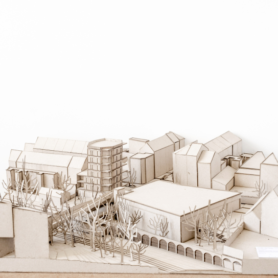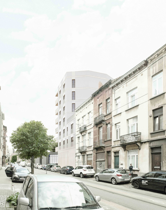 Near the Verboekhoven intersection and the Lambermont boulevard, which are structuring axes in the district, the project plot is located in the northern part of Schaerbeek. The new metro axis will one day allow a greater flow to be drained towards the station and the centre of Brussels and will promote a gentle densification of this residential area. The project in question here makes it possible to anticipate this urban change and anticipate this new polarity. Bourgeois facades with cast iron railings and elaborate ornamentation are replaced by simpler housing, witnesses to the industrial character of 19th century Schaerbeek, our project also assumes to be the witness of its time. In the district, it is not uncommon to see the slanted span, at the corner of a street, topped with dormers, turrets, and bell towers. Thus creating an event in the facade alignments supporting the transition between two universes. The volumetric resolution that we propose is to enhance the angulation by attaching the building's template to the neighboring adjoining wall but by raising it at the corner to address the project to the public space - whether it is the street or the future metro esplanade.