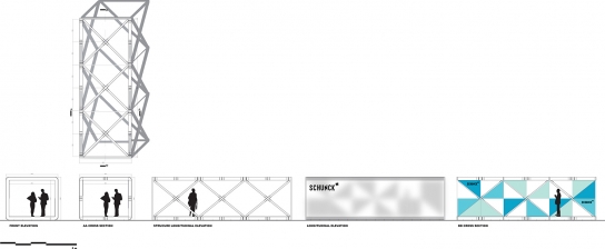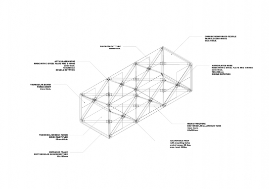 We have designed a building composed of a primary structure, a framework that defines a flexible space and a flexible and waterproof outer shell that follows the contours of the metal structure. Outside, the pavilion has a smooth, translucent skin. He sees himself as a mere object, detached from any context. The canvas becomes a readable surface like a billboard or display.
