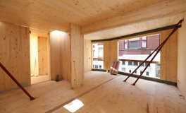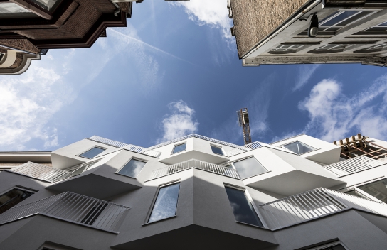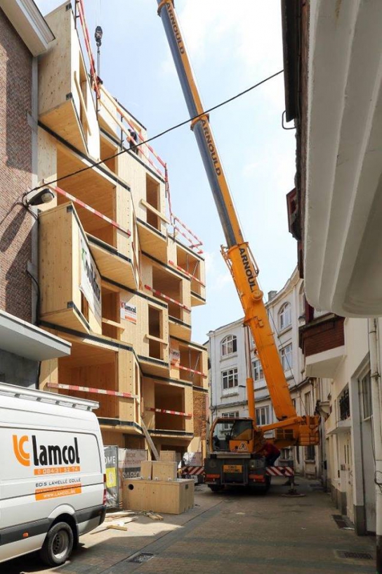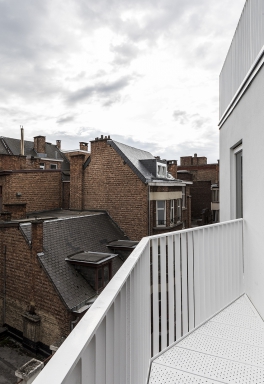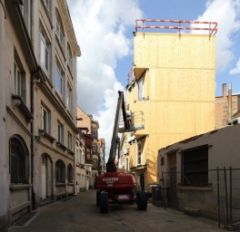 The building is located in a small alley in the city center. This is characterized by its narrowness and the typical art-deco architecture of some buildings on the south side of the street. The volumetry of the building was worked with a set of redans to create a rhythm in the facade harmonizing with the facades of the street, themselves quite worked with parts in excess of the plane of the facades. Like a ribbon, each level folds and is superimposed on a level whose folds are alternated. It is also a way of generating extra space to provide more comfortable living spaces in the dwellings. In addition, the redans allowed to direct the views towards the street rather than to have a direct confrontation with the houses located on the other side of the street. The building is designed to be built in wood frame and be very energy efficient. The living areas of the dwellings are largely open on the south side and the overhangs on the front side become well oriented terraces. A penthouse set back on the roof enjoys a breathtaking view of the city and a vegetated terrace. Given the very specific program, the project was worked out so that these micro-dwellings are very easily manageable in the long term from an energy point of view. To do this, it was necessary to aim for autonomy and to limit the common organs but at the same time drastically limit losses. The building is therefore very low energy. The low coefficient of heat loss of the carrier material (CLT) combined with a high performance external insulation make the envelope very effective.