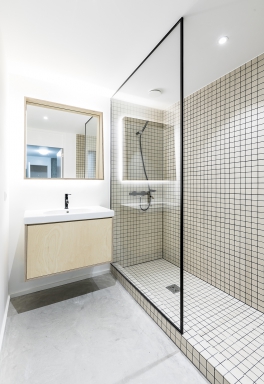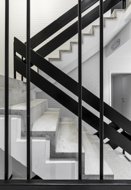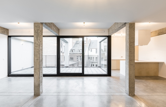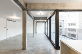 Inside, the raw concrete structure has been cleared of its finishes. In this way, we find on the ceiling, the orthogonal grid that we find vertically on the facade. Which gives fairly rhythmic spaces by the right angle of the structure. The old concrete is raw, marked, it bears the traces of successive transformations. This contrasts with new concrete with smooth, shiny ground.