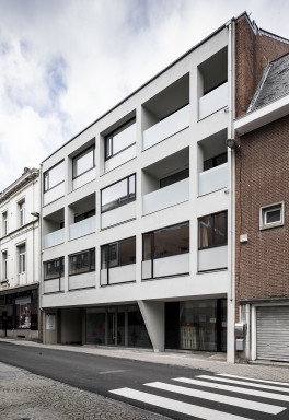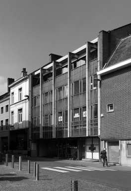 Located in the center of Namur, this building of the 70s was originally designed as an office building. The ground floor is set back from the alignment of the adjoining facades. Three trays of offices are then stacked with a cantilever covering the sidewalk. The plan of the plateaux was relatively free since it was built with a system of reinforced concrete columns and columns. This concrete frame was visible from the outside since the curtain wall was set back from the structure.