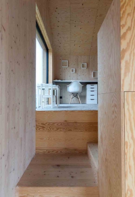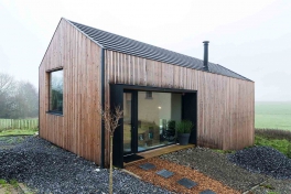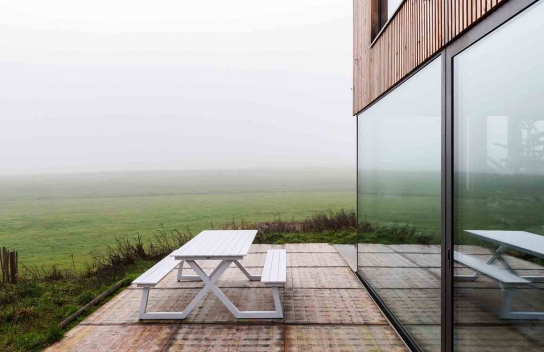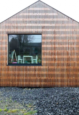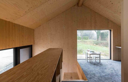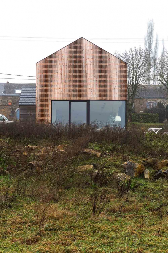This family house, located in the countryside of Namur, is the proof that you can make architecture with few ressources. The construction site had many strenghts; like an unobstructed view over the fields, a south-west orientation, a slight slope... The command was to build a small house with three bedrooms and one bathroom on a thight budget. During the design process, we made the choice to implement small spaces with large openings to highlight the views over the garden, in order to create a sensation of space and to get profit from the heat of the sun in the wintertime. An other way to improve the qualities of the house without make it bigger was to create polyvalent spaces melting into each other. The entrance, is located in the staircase, on a split level. A bookshelf separates it from the living room and this piece of furniture is also the balustrade of the study room upstair. This combination aids greatly in creating a spacious feeling. The house is very performant, it’s well insulated and it’s only heated by a wood stove.