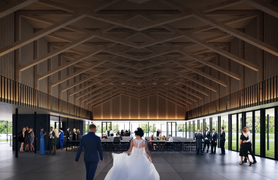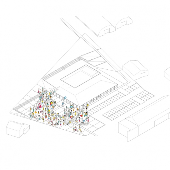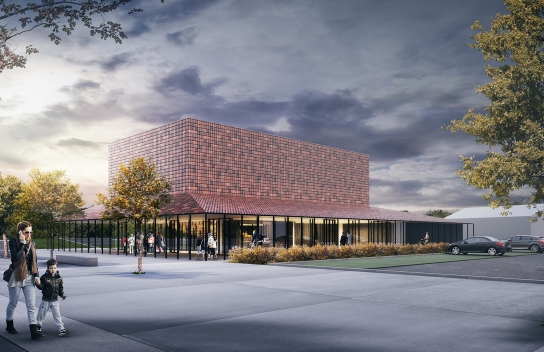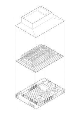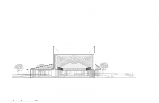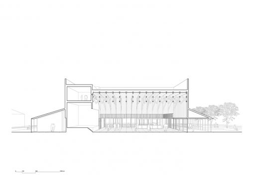 (administration, rural house, house mutli-services, early childhood home,...) and in doing so, to induce a new dynamic within the village. The stake of a rural house in this place is particularly interesting. It is a program that brings together. The goal is to allow the village to come to life, to live to the rhythm of various initiatives. From the outside, the building is recognizable, the height of the room is immediately identifiable and creates a new landmark in the landscape. Tocover spaces where high ceilings are not required, a sloped roof extends asymmetrically as neededin relation to the area to be covered or sheltered from the sun. This volumetric set is treated withthe same material, it is a vernacular material used for centuries in the region: the interlocking S-tile. It is a local material, inexpensive and hasa reassuring side. Its format makes it possibleto create a graphic pattern in the volume by playing on the various existing shades. It is a contemporary way to implement this material which reminds, seen from the sky, the graphics of the hesbignons landscapes marked by the plot and the color of the cultures. The volume is carved organically according to the needs. Its frame is made of wood. The frameworks of the old farms of the region were studied according to the needs of the spaces to be covered. The structural system of the new rural house is inspired by this process. The volume is made of a real woodframe. Its complex shape is studied to best meet structural constraints while using the leastamount of material possible. From the outside, only the terracotta volume of the main room is visible, surrounded by shed whose slope has been studied to give the whole of the harmonious proportions.