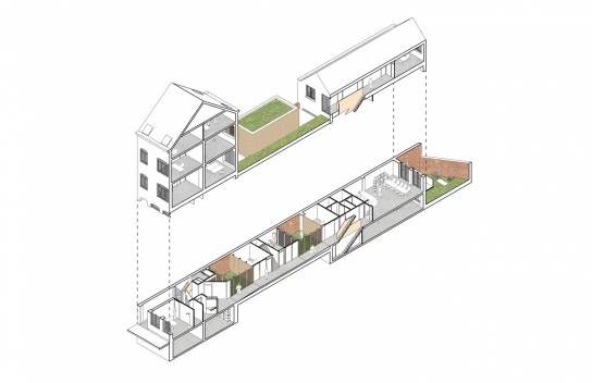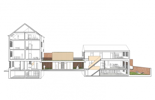 In order to reduce heating operation costs, it was important to recreate a built-in communication between the front and the rear building. In addition, the building had to be accessible to people with reduced mobility. The connection is materialized in the form of a glazed corridor, the demolition of the extension makes it possible to increase the solar input. two patios are created like breaths between the old buildings and the new offices located in the center of the plot. The corridor, in summer, can be completely open on these outdoor spaces so as to increase the impression inside-outside already present thanks to the big picture windows of the corridor.