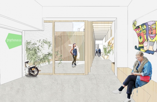 The corridor is not a simple connection, it has been sized to divide the waiting area into several small areas that develop along the way. The waiting space is much freer, it is a joint that becomes, by its dimensions and the link it has with the patios, a real space of life, meetings and exchanges.